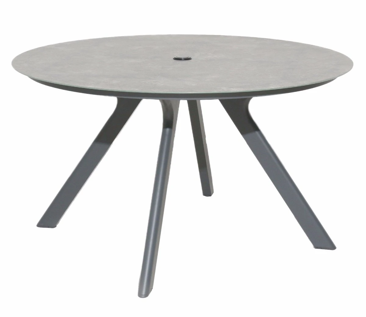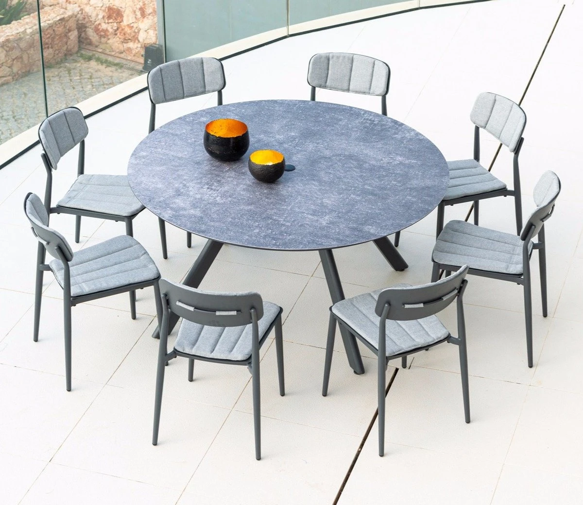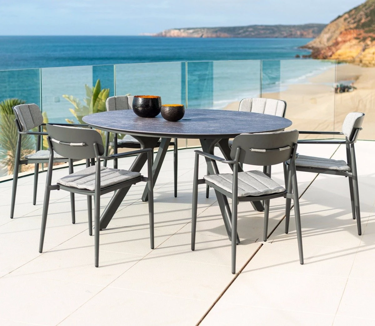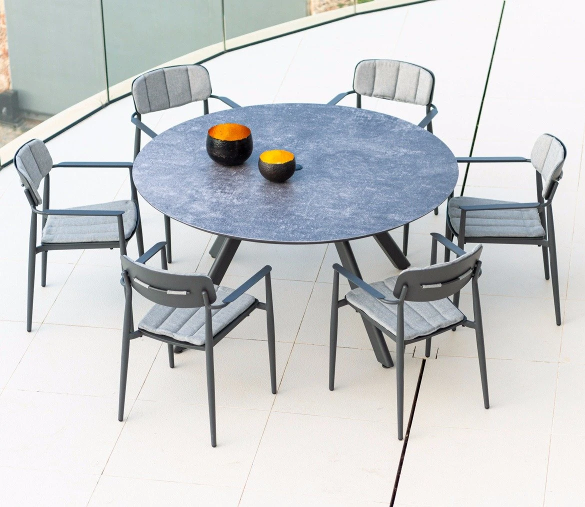 Everything about this round table, which is supported by an aluminium frame that’s powder coated to achieve a durable matt grey finish, indicates a tremendously high standard of design and manufacture.
