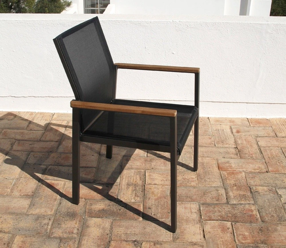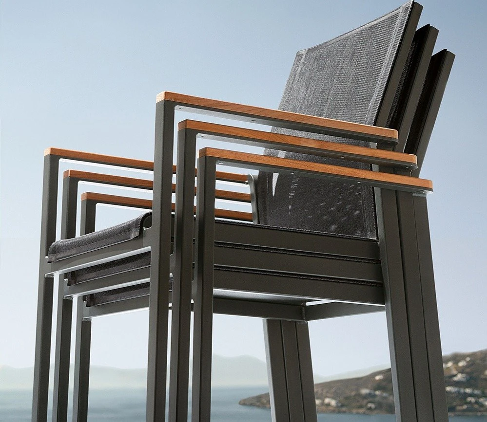 Available with a choice of White with Pearl, Champagne with Titanium or Black with Charcoal, with all three featuring Teak arms. Textilene is a durable and tough material that is woven from polyester yarn and then coated with PVC. It’s made to withstand years of outdoor use.