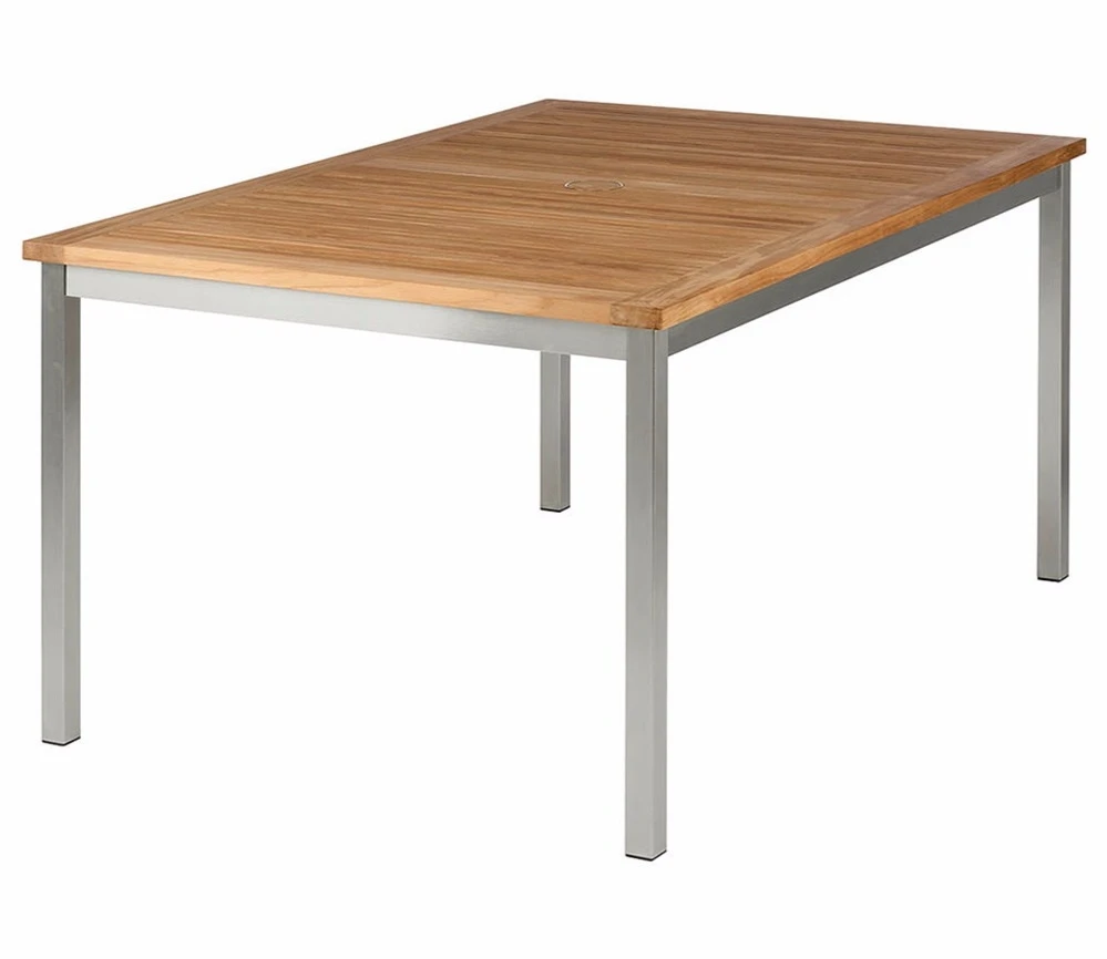The Equinox 150cm Rectangular Dining Table from Barlow Tyrie features marine grade stainless steel and plantation grown teak hardwood.