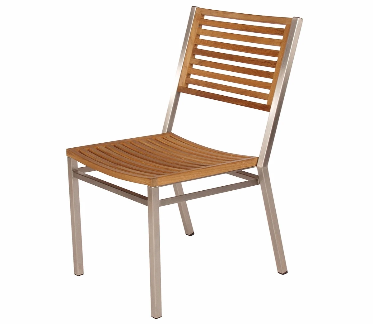 Stackable chairs such as this Side Chair In Teak from the Equinox range of outdoor furniture offer a convenient and elegant place to sit.