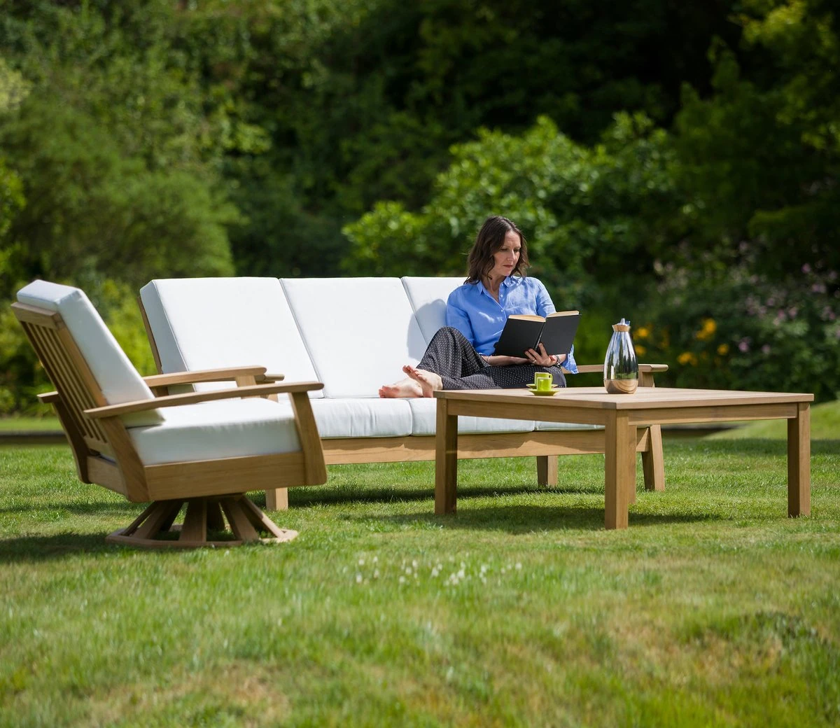 Constructed using the highest grade-A teak, adding not only to its durability but its contemporary style. The deep seating cushion with a high backrest is made from sunbrella fabric, a 100% solution-dyed acrylic fibre that will not fade in sunlight and boasts weather resistance. You can choose the colour of your cushions from the extensive list below. You can also opt to have your cushions made 100% weatherproof.