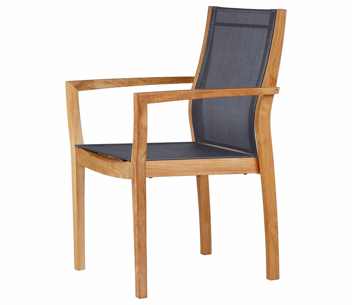 Very durable teak, which has enviable weather resistance, is used for the frame while Textilene, which is woven from polyester yarn and then coated with PVC, is the material used for the slings.