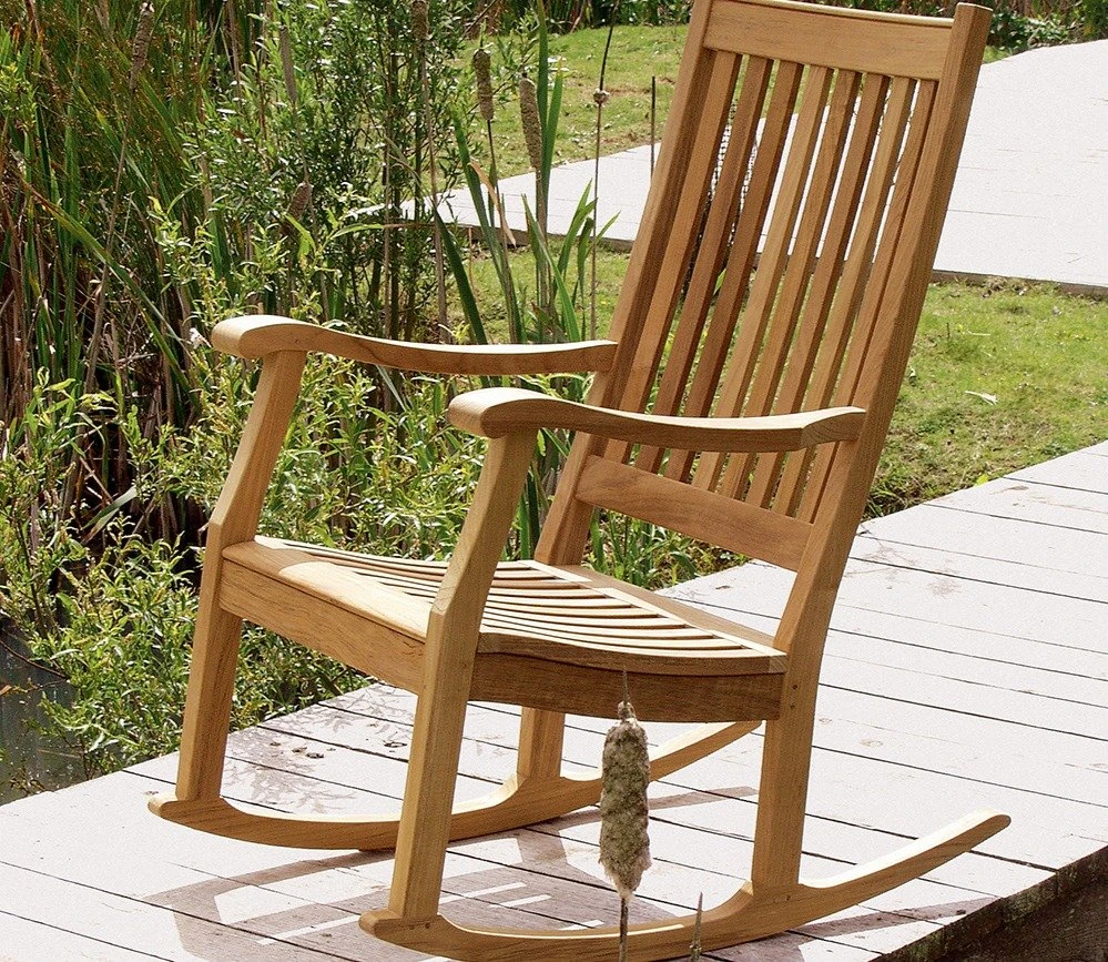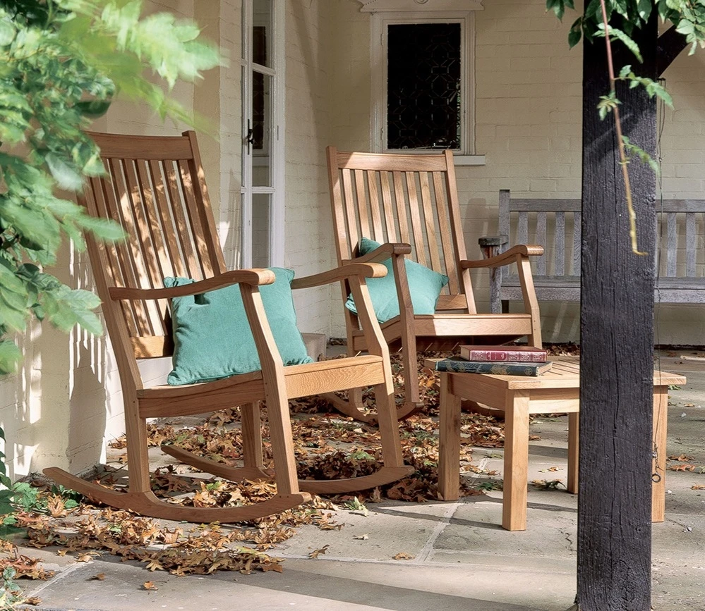 A wonderful traditional Newport Rocking Chair by Barlow Tyrie is robustly made from solid teak, the ultimate way to relax whether indoors or outside on the patio.