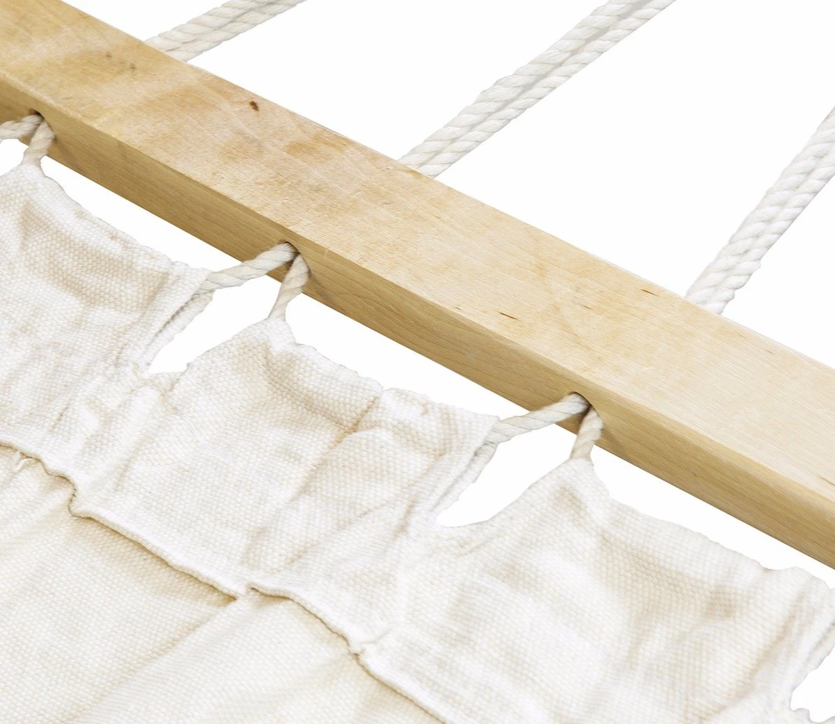 Freestanding and with an adjustable height, the cream-coloured cotton canvas is suspended from the two ends of the arc and will provide a comfortable retreat for two people who will thoroughly enjoy the hammock’s inimitable comfort.