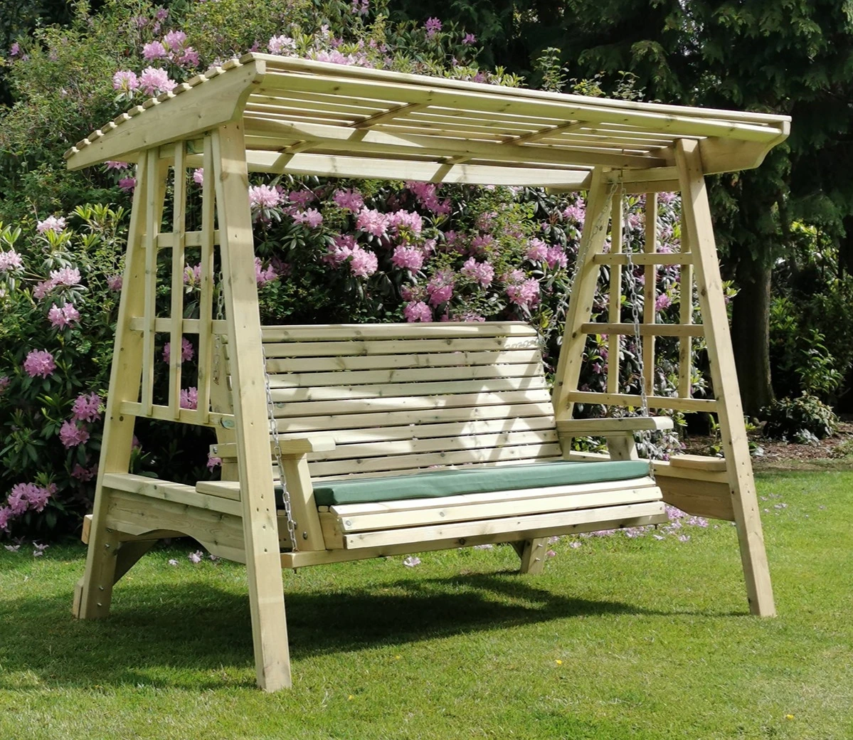 Shade is provided by an attractive canopy and a lattice decorates the sides of the swing. The contoured bench seat couldn’t look more inviting and a cushion can be added in black, green or navy for added comfort.