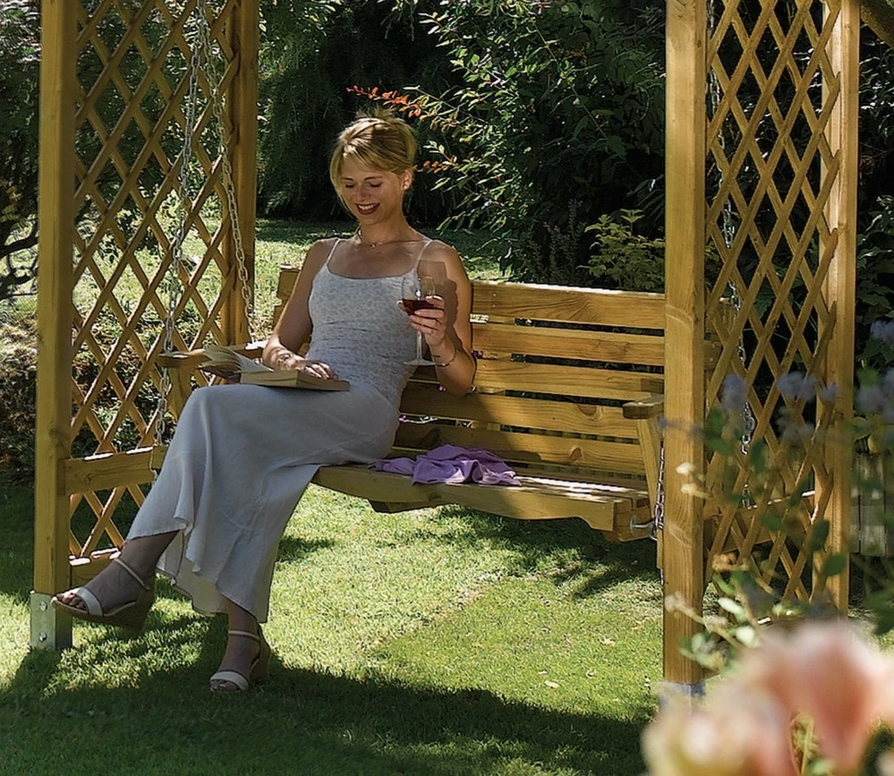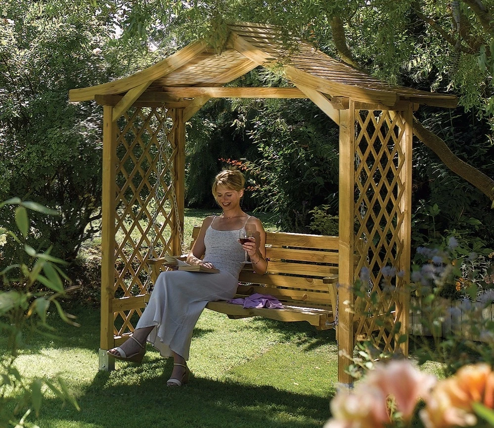 Intricate trellis work decorates the sides below a roof that has a definite Eastern influence, but the main feature that sets it apart from most other arbours is the wonderful swing seat.