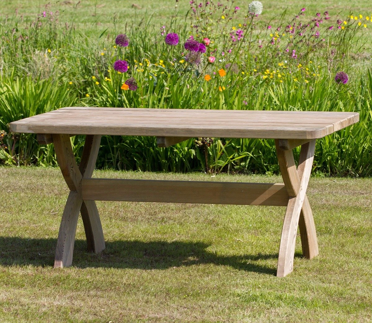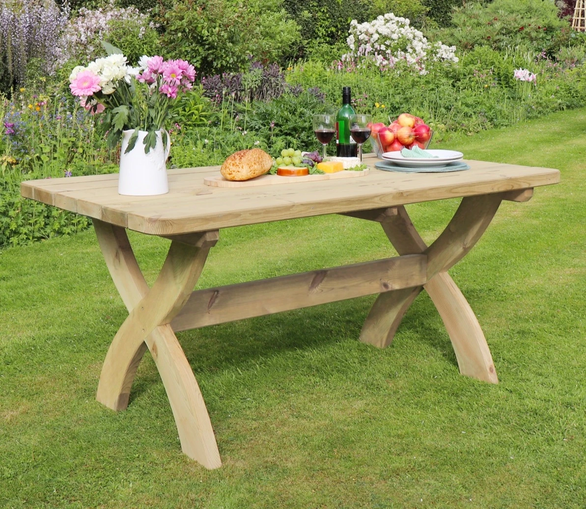 This marvellous table is as robust as it looks but this reassuring quality is blended with the appeal of curved supporting legs and added to by the lovely colour of natural wood which has been pressure treated against rot.